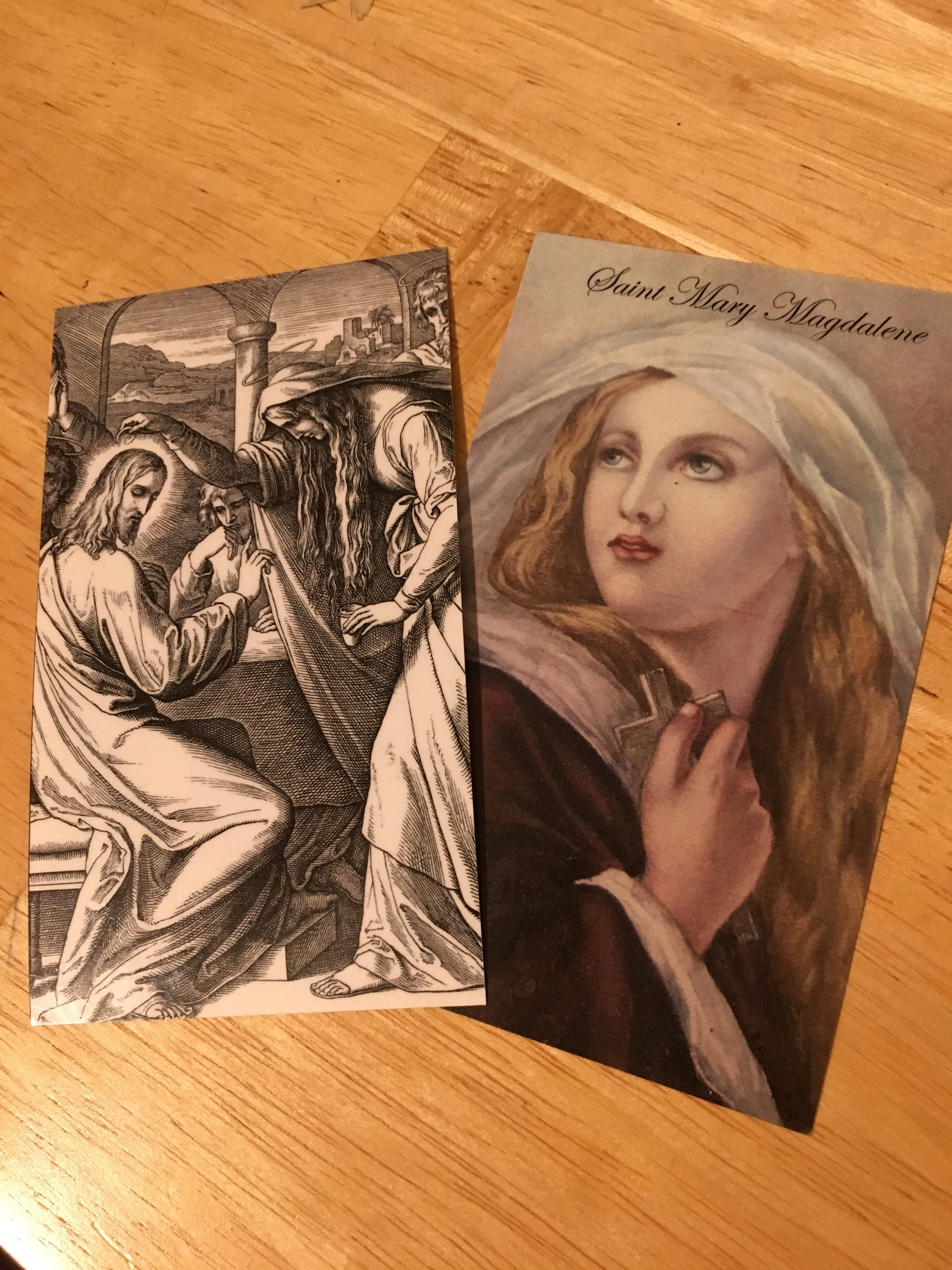 A month or so later we signed the kids up for swim lessons with a wonderful woman and on the last day we discovered our shared faith. We swapped stories of travels and pilgrimages and she ended our time saying, “I have holy cards. The kids can each pick one!” If you aren’t Catholic, or familiar with holy cards, they are like trading cards for Catholic saints. My kids have a great affinity for them so when she pulled out a bagful the boys quickly looked for another St. Michael the Archangel (nothing says holy like a sword-wielding angel slicing off the devil’s head). Our swim instructor turned to me, “Let me pick one out for you too!” She searched through her pile of 100 or so cards (let me tell you, its easy as a Catholic to acquire this many) and grabbed one and said, “This one!” Mary Magdalene. I laughed at the coincidence of her coming up twice in such a short period and we said our goodbyes and off I took the kids to the store.