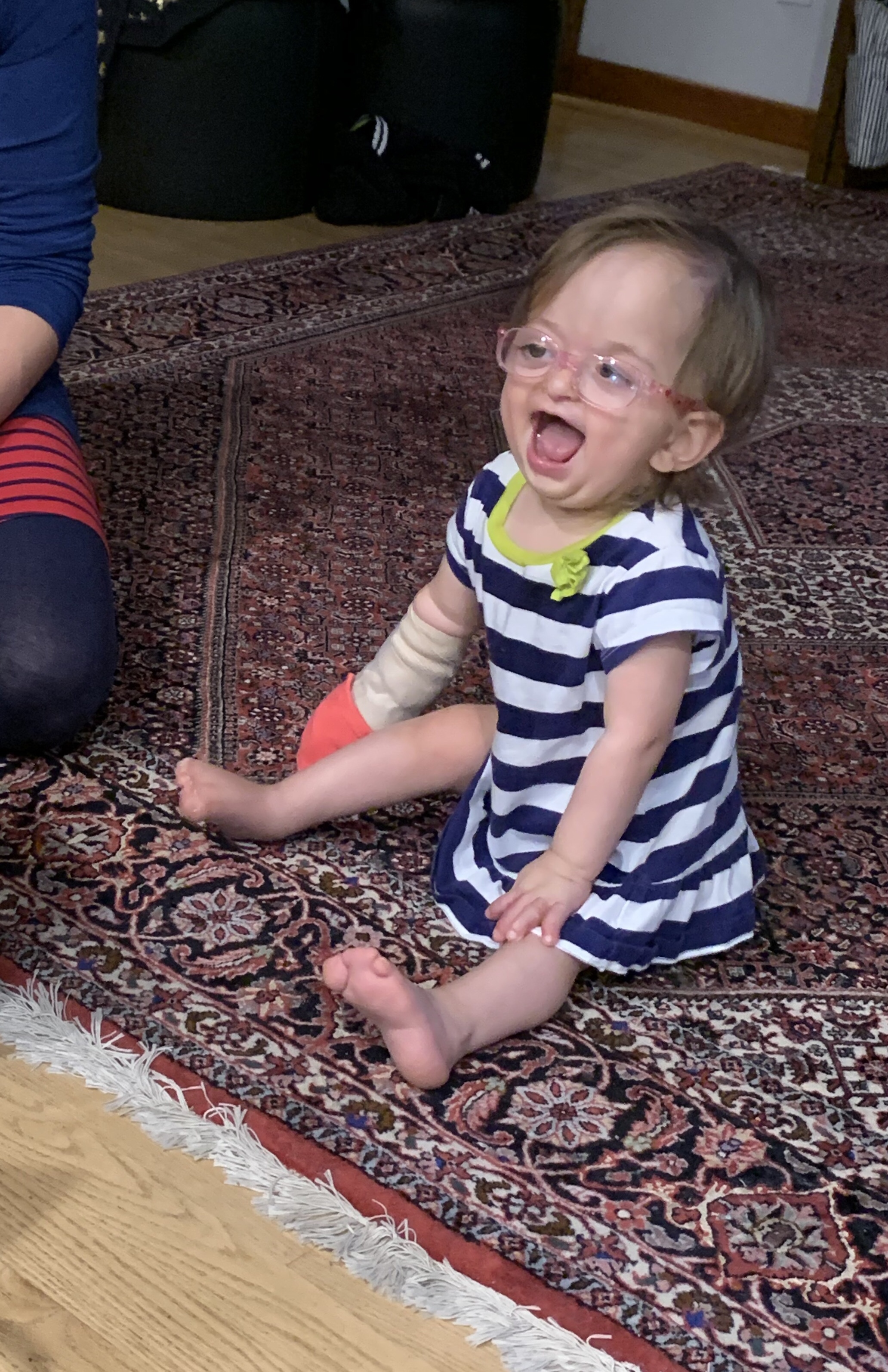 Carlos and I looked at Maggie and said, “Sorry kid.” I was waiting for the moment that we put the glasses on, the routine of them going on and her pulling them off and getting frustrated at them being on her face. We put them on her, she smiled and clapped and that was that. No crying and fussing, just, “Okay.” Maybe Maggie could understand the doctor, I don’t know, but Maggie has worn her glasses since. She does get tired of them towards the end of the day and when they get “gooped up” by her midmeal fingers, but other than that she wears them happily.